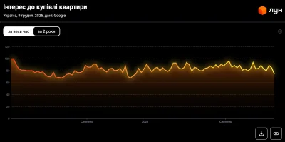В 2025 році цікавість до купівлі квартири в Україні загалом трималась на рівні минулого року. Але на відміну від 2024, в поточному році вона характеризувалась нерівномірністю попиту — протягом року фіксувались спади та зростання інтересу. Проте загалом бачимо, що в 2025 році зацікавленість в купівлі житла мала тенденцію до зростання.