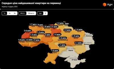 Щодо цін на первинці в розрізі мінімальної вартості цілої квартири, то наприкінці 2025 року вона найнижча в Сумах — $23,2 тис. або 1 млн грн. А найвища у Львові – мінімальна вартість майбутньої квартири на первинці в місті Лева становить $61,7 тис. або 2,6 млн грн, що в 2,5 рази більше, ніж в Сумах.