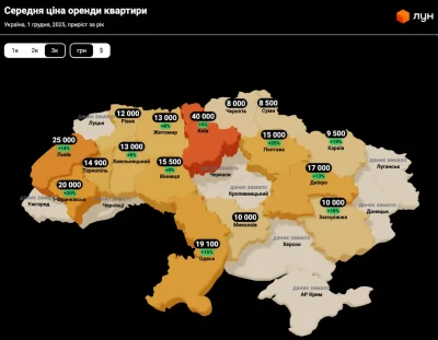 Дещо іншу картину бачимо в сегменті оренди 3-кімнатних квартир. Тут у більшості міст середні ставки за рік не змінились. Але ті міста, в яких зміна все ж таки відбулась, ціна оренди піднялась на відчутний відсоток. Зокрема, на початку грудня 2025 року орендувати 3-кімнатну у Львові на 14% дорожче ніж рік тому, в Одесі – на 15%, в Івано-Франківську — на 20%, в Полтаві – на 25%.